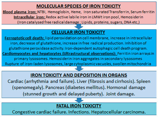 Within this context, the presence of excess iron, mainly in the form of intracellular hemosiderin and associated low molecular weight (LMWt) labile iron, can progressively cause molecular, cellular, and tissue damage, and a vicious circle leading to oxidative stress toxicity damage in cells (Figure 2) [57,65,66,67].