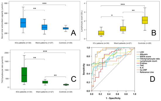 Serum total antioxidant capacity levels (A), absolute lymphocyte counts (B), and total antioxidant capacity (TAC)/lymphocyte ratios (C) in controls, ward, and intensive care unit COVID-19 patients; receiver operating characteristic (ROC) curves of admission laboratory and clinical parameters for differentiating ICU from ward COVID-19 patients (D). * p < 0.05, ** p < 0.01, *** p < 0.001. SOFA score: Sequential organ failure assessment score.