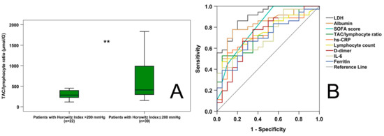 TAC/lymphocyte ratios in COVID-19 patients suffering from mild to no (Horowitz Index > 200 mmHg) and moderate-severe (Horowitz Index ≤ 200 mmHg) acute respiratory distress syndrome (ARDS) (A) and diagnostic capacity of the studied markers regarding ARDS investigated by ROC analysis (B). ** p < 0.01. SOFA score—sequential organ failure assessment score.