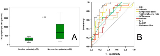 TAC/lymphocyte ratios in survivor vs. non-survivor COVID-19 patients (A) and receiver operating characteristic curves of admission laboratory and clinical parameters for predicting hospital mortality in COVID-19 patients (B). *** p < 0.001. SOFA score—sequential organ failure assessment score.