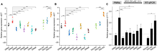 In the central and peripheral nervous system, the main ligand of metabotropic glutamate receptors is the amino acid L-glutamate [54], which acts as an excitatory neurotransmitter [55]. With regard to taste receptors, L-glutamate is an agonist at least for the umami receptor heteromer TAS1R1/TAS1R3 on the tongue [9]. Since mGlu receptors and TAS1R1/TAS1R3 are sharing the same ligand, we investigated the effect of a 24 h incubation with MSG at a typical plasma concentration of 50 µM [56] on the expression levels of GRM and TAS1 receptor genes in isolated PMNs in vitro. Transcriptional regulation of GRM2, for example, in primary neurons has been shown to be significant and persistent up to 24 h and longer in previous studies [57,58]—we did not, however, perform time kinetics for receptor gene expression. Our RT-qPCR-based analysis of mRNA levels revealed a 2.4-fold higher relative gene expression of GRM2 and a 2.1-fold increase in TAS1R3 transcripts, significantly different from the transcript levels of other GRMs and TAS1Rs (Figure 1C).