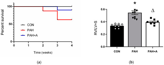 Validation of the establishment of PAH. (a) Survival percentage, (b) RV hypertrophy, (c) percentage of thickening of pulmonary arterial walls, and (d) representative images of the pulmonary arteries of the control (CON), with saline solution as the vehicle; PAH group (PAH) induced by 60 mg/kg/s.c. of MCT; and PAH with 16 mg/kg of allicin (PAH + A). Data are presented as mean ± standard error. Differences were tested by ordinary one-way ANOVA followed by the Bonferroni post hoc test for multiple comparisons, and significant differences between groups were set at p ≤ 0.05 n = 8, * p ≤ 0.05 vs. control; Δ p ≤ 0.05 vs. PAH.