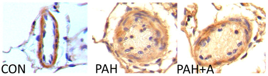 Some of the structural changes associated with vascular remodeling and vasoconstriction in PAH include smooth muscle cell proliferation and smooth muscle cell hypertrophy. In this context, we determined the alpha-smooth muscle actin expression as a marker of artery muscularization through immunohistochemistry. The results showed a stronger positivity to α-SMA in slices of PAH than in the control group, which was decreased with the allicin treatment (Figure 2).