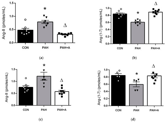 Allicin effects on angiotensin concentration at the systemic and local level. Ang-II concentration in (a) lung tissue and (c) serum. Ang-(1-7) concentration in (b) lung tissue and (d) serum. Control group (CON), with saline solution as the vehicle; PAH group (PAH) induced by 60 mg/kg/s.c. of MCT; and PAH with 16 mg/kg of allicin (PAH + A). Data are presented as mean ± standard error. Differences were tested by ordinary one-way ANOVA followed by the Bonferroni post hoc test for multiple comparisons, and significant differences between groups were set at p ≤ 0.05. n = 8, * p < 0.05 vs. control; Δ p < 0.05 vs. PAH.