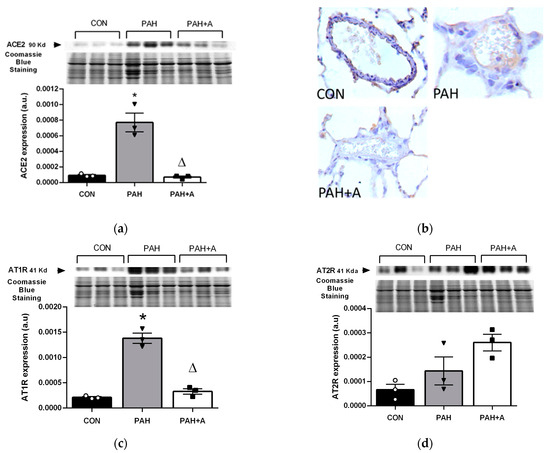 Effects of allicin on the protein expressions of ACE2, AT1R, and AT2R in lung tissue. Immunoblotting assay of (a) ACE2 and (b) representative micrographs of immunohistochemistry detection, and (c) protein expression of AT1R and (d) AT2R in lung tissue. Control group (CON), with saline solution as the vehicle; PAH group (PAH) induced by 60 mg/kg/s.c; and PAH with 16 mg/kg of allicin (PAH + A). For Western blotting, three randomly selected samples per group were analyzed. All micrographs 40×. Data are presented as mean ± standard error and were analyzed using the Kruskal–Wallis test. Significant differences between groups were set at p ≤ 0.05. n = 3, * p < 0.05 vs. CON; Δ p < 0.05 vs. PAH.