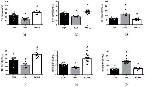 Allicin effects on endothelial function markers in lung and serum in PAH. Concentration of (a) NO, (b) BH4, and (c) BH2 in lung tissue. Concentrations of (d) NO, (e) BH4, and (f) BH2 in serum. Control group (CON), with saline solution as the vehicle; PAH group (PAH) induced by 60 mg/kg/s.c; and PAH with 16 mg/kg of allicin (PAH+A). Data are presented as mean ± standard error. Differences were tested by ordinary one-way ANOVA followed by the Bonferroni post hoc test for multiple comparisons, and significant differences between groups were set at p ≤ 0.05. n = 8, * p < 0.05 vs. control; Δ p < 0.05 vs. PAH.