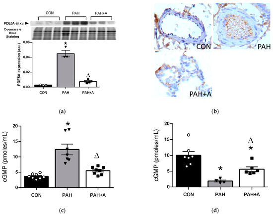 Allicin effects on PDE5 and cGMP. (a) PDE5 protein expression in lung tissue and (b) representative micrographs of immunohistochemistry detection. Concentrations of cGMP in (c) lung and (d) serum. Control group (CON), with saline solution as the vehicle; PAH group (PAH) induced by 60 mg/kg/s.c; and PAH with 16 mg/kg of allicin (PAH + A). For Western blotting, three randomly selected samples per group were analyzed. All micrographs 40x. Data are presented as mean ± standard error and were analyzed using the Kruskal–Wallis test. Significant differences between groups were set at p ≤ 0.05. n = 3, * p < 0.05 vs. CON; Δ p < 0.05 vs. PAH. Data of GMP are presented as mean ± standard error. Differences were tested by ordinary one-way ANOVA followed by the Bonferroni post hoc test for multiple comparisons, and significant differences between groups were set at p ≤ 0.05. n = 8, * p < 0.05 vs. CON; Δ p < 0.05 vs. PAH.
