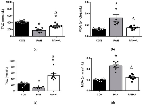 Effects of allicin in total antioxidant capacity (TAC) and malondialdehyde (MDA) as oxidative stress markers. The concentration of (a) TAC and (b) MDA) in the lung. The concentration of (c) TAC and (d) MDA in serum. Control group (CON), with saline solution as the vehicle; PAH group (PAH) induced by 60 mg/kg/s.c; and PAH with 16 mg/kg of allicin (PAH + A). Data are presented as mean ± standard error. Differences were tested by ordinary one-way ANOVA followed by the Bonferroni post hoc test for multiple comparisons, and significant differences between groups were set at p ≤ 0.05. n = 8, * p < 0.05 vs. control; Δ p < 0.05 vs. PAH.