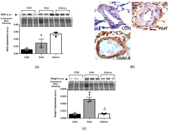 Effects of allicin on Nrf2 and Keap1 proteins on PAH. (a) Nrf2 by Western blot, and (b) representative micrograph of immunohistochemistry, where Nrf-2 is strongest in the arterial endothelium and muscle cells of PAH + A compared with the other groups. (c) Keap1 protein expression in lung tissue. Control group (CON), with saline solution as the vehicle; PAH group (PAH) induced by 60 mg/kg/s.c; and PAH with 16 mg/kg of allicin (PAH + A). For Western blotting, three randomly selected samples per group were analyzed. All micrographs 40×. Data are presented as mean ± standard error and were analyzed using the Kruskal–Wallis test. Significant differences between groups were set at p ≤ 0.05. n = 3, * p < 0.05 vs. control; Δ p < 0.05 vs. PAH.