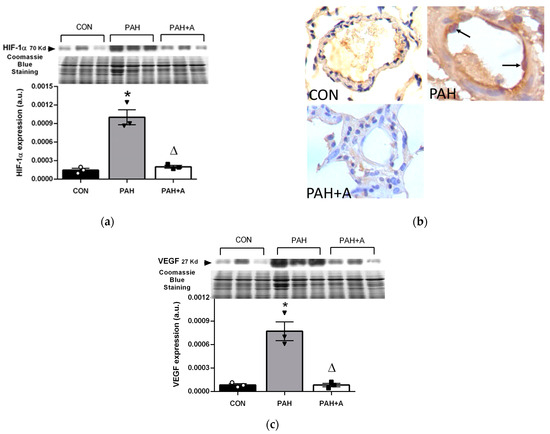 Allicin effects on markers of hypoxia in PAH. Protein expression of (a) hypoxia-inducible factor 1-alpha (HIF-1α) by Western blot, (b) representative micrograph of immunohistochemistry, where nuclear staining of HIF 1α is shown (black arrows) in PAH and was not observed in PAH + A group, and (c) protein expression of vascular endothelial growth factor (VEGF). Control group (CON), with saline solution as the vehicle; PAH group (PAH) induced by 60 mg/kg/i.p; and PAH with 16 mg/kg of allicin (PAH + A). For Western blotting, three randomly selected samples per group were analyzed. All micrographs 40×, except HIF-1 in PAH that is 100×. Data are presented as mean ± standard error and were analyzed using the Kruskal–Wallis test. Significant differences between groups were set at p ≤ 0.05. n = 3, * p < 0.05 vs. control; Δ p < 0.05 vs. PAH.
