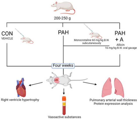 Male Wistar rats weighing 200–250 g were randomly divided into three groups (n = 8 per group): control (CON) (saline solution), pulmonary arterial hypertension (PAH) (a single subcutaneous injection of monocrotaline (60 mg/kg body weight), catalog C2401-1G Sigma-Aldrich, St. Louis, MO, USA), and PAH plus allicin administration (16 mg/kg/oral gavage) (PAH + A) from the beginning of the study (Figure 10). The experimental groups were maintained with commercial pellets for rodents (PMI Nutrition International, Inc., LabDiet 5008, Richmond, IN, USA) and water ad libitum, under 12 h light/dark cycles and room temperature of 22 °C for four weeks.