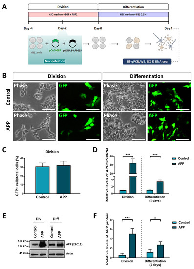 Confirmation of APP overexpression in hNS1 cells after transient nucleofection. (A) Schematic representation of the protocol used for proliferation (division) and differentiation (4 days after nucleofection) of hNS1 cells. (B) Representative images in phase contrast and the corresponding field with GFP+ cells in control-hNS1 cells and APP-hNS1 cells on different days after transfection (division and day 4 of differentiation). Scale bar = 50 μm. (C) Percentage of GFP+ cells with respect to total cells for both experimental groups (control and APP) in cell division. (D) Relative expression levels of APP695 mRNA by quantitative real-time PCR (RT-qPCR) in APP-hNS1 cells and control-hNS1 cells on different days after transfection (division and day 4 of differentiation). (E) Western blot (WB) analysis of APP (using 22C11 antibody) in cell extracts of APP-hNS1 cells and control-hNS1 cells on different days after transfection (division and day 4 of differentiation). Actin was used as a loading control. (F) Relative protein levels of APP by densitometry analysis in both experimental groups (control and APP) on different days after transfection (division and day 4 of differentiation). Data represent mean ± SD (n = 3 for three independent samples). Statistical analysis was performed using a t-test between APP and control groups; * p < 0.05; *** p < 0.001.