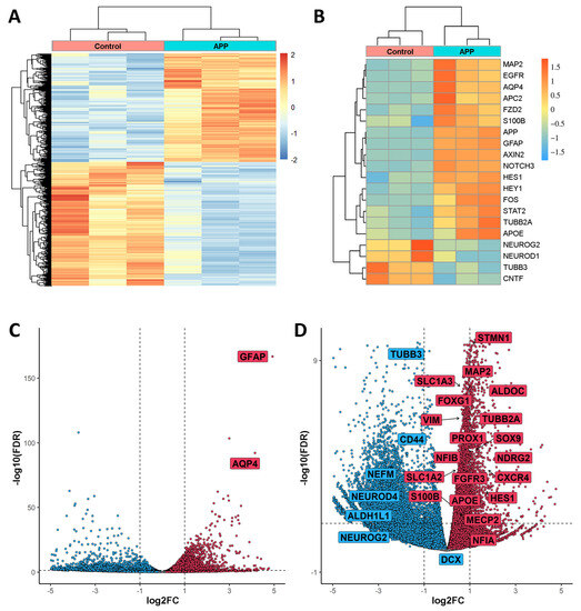Representation of Differentially Expressed Genes (DEGs) found in APP-hNS1 cells versus control-hNS1 cells. (A) Heatmap showing differential RNA-seq counts of the genes with FDR ≤ 0.05 and sorted by logFold Change (logFC). There were three replicates of control samples (derived from control-hNS1 cells) and three replicates of APP samples (derived from APP-hNS1 cells). This heatmap was built using DESeq 2 on normalized gene read counts. (B) Heatmap of the three samples for each condition (APP-hNS1 cells and control-hNS1 cells) and gene expression levels of selected genes using average linkage clustering with Pearson correlation as the default distance metric. (C) Volcano plot from RNA-seq data of APP-hNS1 cells and control-hNS1 cells. The log2FC is plotted on the x-axis, and the negative log10(FDR) is plotted on the y-axis. Some relevant genes increased in APP-hNS1 cells (red dots) are indicated inside a box. (D) Replot of the volcano excluding the highest negative log10(FDR) genes. Red dots show the distribution of increased genes, and blue dots show the distribution of decreased genes in APP-hNS1 cells versus control-hNS1 cells. Some genes related to gliogenesis, neurogenesis, and different pathways mentioned in this study are indicated inside a box.