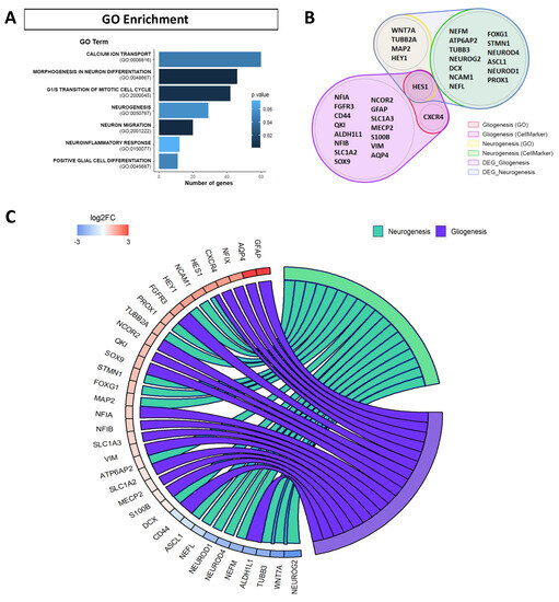We focused the analysis on the changes in the expression of DEGs related to cell differentiation in NSCs (gliogenesis and neurogenesis). Although GO is an international standardized gene functional classification system, we decided to include novel cell-type marker genes found in the CellMarker and Panglao databases (Figure 3B, Supplementary Table S1B).