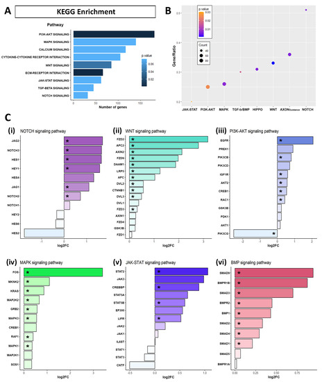 Signaling pathways enrichment of the genes differentially expressed (DEGs) in RNA-seq assays due to APP overexpression. (A) Kyoto Encyclopedia of Genes and Genomes (KEGG) pathways enrichment for all the DEGs altered by APP overexpression versus control in hNS1 cells, obtained with Enrichr. Representation of the signaling pathways are indicated with the bar length by the number of genes and the p-value by the color blue gradient. (B) Dotplot showing the results of KEGG pathways enrichment for the genes upregulated in APP versus control hNS1 cells. The y-axis represents the ratio between the number of genes participating in the analysis and the total annotated participants of the KEGG pathway. The dot color indicates the p-value, and the dot size indicates the number of genes. (C) Results of the RNA-seq analysis of APP-hNS1 cells versus control-hNS1 cells, representing the expression of genes as log2FC, included in KEGG signaling pathways of Notch signaling (i), Wnt signaling (ii), PI3K-AKT signaling (iii), MAPK signaling (iv), JAK-STAT signaling (v), and BMP signaling (vi). Significant differentially expressed genes are marked with an asterisk (*).