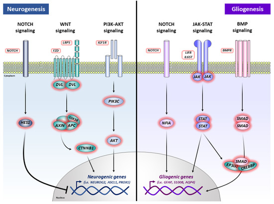 There are numerous studies linking Notch signaling [45], Wnt signaling [46], PI3K-AKT signaling [47], JAK-STAT signaling [48], and BMP signaling [49] with proliferation and phenotypic specification of NSCs. The involvement of some of these signaling pathways in certain cellular processes mediated by APP and/or its proteolytic derivatives has even been described. Specifically, it has been reported that sAPPα induces glial differentiation of NSCs through the Notch pathway [50], the JAK-STAT pathway [51], and the BMP pathway [17].