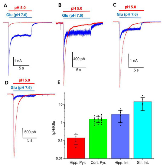 Comparison of responses of isolated rat brain neurons to glutamate at pH 7.6 and to acidification. (A–D), representative recordings from pyramidal neurons of the hippocampal CA1 area (A), interneurons from the hippocampus CA1 area (B), pyramidal neuron of the prefrontal cortex (C), and giant interneurons of the striatum (D). Responses of glutamate receptors (blue) were evoked by application of 3 mM glutamate 10 µM Gly. ASIC responses (red) were evoked by pH drop to 5.0. The colors of the application bars correspond to the color of the current recording. Note, the amplitude scale bars are different for (A–D). (E), ratio of the peak current evoked by acidification to pH 5.0 (IpH), and to glutamate at pH 7.6 (IGlu).