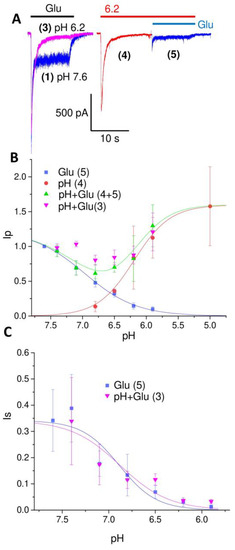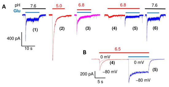 The extracellular protons target many important proteins, including the ion channels. For instance, sodium channels [15,16,17] and nicotinic cholinoreceptors [18,19] are inhibited by protons. Extracellular acidification results in inhibition of the ionotropic glutamate receptors. The pH50 for AMPA receptor inhibition is about pH 6.2 [20,21]. The NMDA receptors are even more sensitive; some NMDA receptors are inhibited even at neutral pH [22]. By comparison, the pH50 values for neuronal ASIC activation are usually between pH 6.6 and 6.0, meaning that no pH conditions can provide ASIC activation without inhibiting NMDA and AMPA receptors. The opposite effects of protons on ASICs and ionotropic glutamate receptors suggest a possible role of ASICs in neural transmission. In particular, the inhibition of glutamate receptors by extracellular protons could be compensated by ASIC activation. This effect could provide stability of the total response under different acidification conditions.