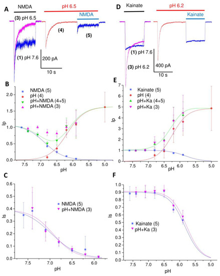 Responses of glutamate receptors and ASICs at different pH values to NMDA (A–C) and kainate (D–F) in pyramidal neurons of the prefrontal cortex. (A,D), representative recordings for pH 6.5 (A) and 6.2 (D). Numbers in brackets specify responses in the experimental protocol (Figure 2). Responses to glutamate agonists, acidification, and simultaneous application of glutamate and low pH are shown in blue, red, and magenta, respectively. (A), the response to NMDA at low pH (3) is only slightly smaller than the control response at pH 7.6 (1). This is due to the activation of ASICs (4) that compensates for the inhibition of NMDA receptors by protons (5). (D), Responses to kainate are weakly inhibited by protons. As a result, the response to kainate at low pH is increased due to the activation of ASICs. (B,C,E,F) pH-dependence of peak (Ip, (B,E)) and steady-state (Is, (C,F)) components of the responses. Green symbols (pH + NMDA or kainate) show the sum of the components mediated by ASICs (response 4) and glutamate receptors (response 5). Magenta symbols (pH + NMDA or kainate (3)) show the currents evoked by simultaneous application of GluR agonist and low pH. In panels (B,C,E,F), the Ip and Is are dimensionless values obtained by normalizing to the response to NMDA or kainate at pH 7.6. Smooth curves were obtained by fitting the experimental data by Hill equation (see Section 4).