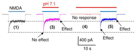 Figure 3B and Figure 4B demonstrate an interesting peculiarity. The sum of the amplitudes of the responses to acidification (4) and to glutamate (5) (Figure 3B) or NMDA (Figure 4B), which are shown in green, are smaller than the amplitude of the total response (3, shown in magenta). One possible explanation for this effect is the recently found potentiating effect of glutamate on ASIC1a [30]. We checked this possibility by activating ASICs by pH drops to 6.5, both in the presence and in the absence of 3 mM glutamate. The glutamate receptors were inhibited by a combination of DNQX (10 µM), GYKI (200 µM), Mg2+ (5 mM), and the absence of Gly. This composition of antagonists eliminates the response to glutamate almost completely. However, the responses to acidification, both in the absence and in the presence of glutamate, did not differ significantly. Glutamate, as well as other selective ASIC1a potentiators such as histamine [31], are unlikely to potentiate native heteromeric ASICs [28]. An alternative explanation is that extracellular protons cause stronger inhibition of the peak NMDA receptor response if they are applied prior to the receptor activation (response 5), as compared with application simultaneously with activation (response 3). Indeed, Figure 4B,C and Figure 5 (representative recordings at pH 7.1) demonstrate that, at pH 7.1, no significant ASIC-mediated currents (response 4) are seen, and response 3 (simultaneous application of protons and NMDA) is mediated by NMDA receptors only. The peak component of this response is not affected significantly (0 ± 5%, n = 5), whereas the steady-state response is inhibited by 28 ± 5% (n = 5). At this pH value, both peak and steady-state components of response 5 (protons are applied before the receptor activation) are inhibited equally at 22 ± 7% (n = 5) and 26 ± 3% (n = 5), correspondingly. Likely, the kinetics of proton block is not fast enough to provide full development of the effect on the peak current if the protons are applied simultaneously with activation.