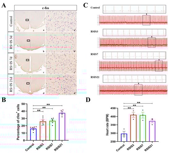 The c-Fos gene is one of the most widely studied immediate early genes in the brain and is expressed when neurons are excited, which often serves as a marker of neuronal activation. Previous studies have shown that stress could activate DMH neurons and increase the heart rate in rats [8,9]. Therefore, in this study, we first detected the changes in c-Fos protein expression in the DMH and heart rate of rats by immunohistochemical staining and electrocardiography, respectively. Quantitative analysis of the immunohistochemical staining revealed that stress treatment led to a significant effect on the expression of c-Fos (Figure 1A,B). Post hoc testing indicated that the percentage of c-Fos-positive cells obviously increased after 3 days (p < 0.01), 7 days (p < 0.01), and 21 days (p < 0.01) of stress exposure compared with the control group. This suggests that stress significantly activates DMH neurons. Given that the activation of DMH neurons is closely associated with an increase in heart rate, we subsequently monitored the changes in HR (beats/min, bpm) of rats after the stress treatment. ANOVA and post hoc comparisons demonstrated that the HRs of the rats were significantly increased after 3 days (p < 0.01), 7 days (p < 0.01), and 21 days (p < 0.01) of stress exposure (Figure 1C,D).