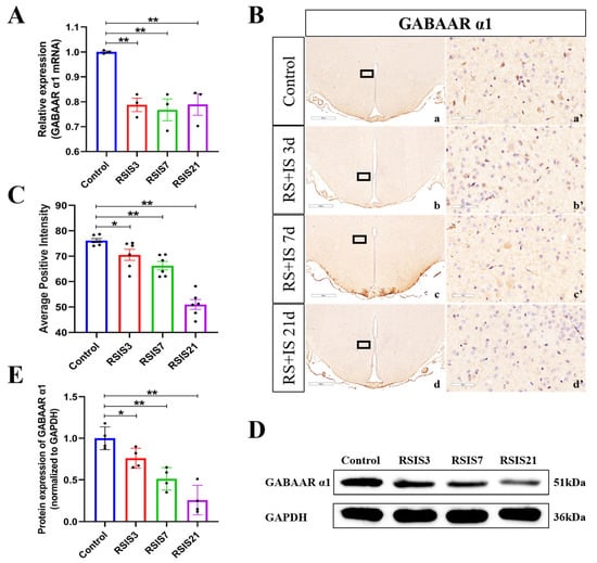 2.2. Stress Decreased the Expression of the GABAAR α1 Subunit