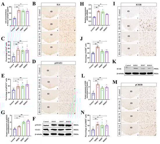 Stress-induced increase in IL-6 activated the JAK/STAT pathway, promoting the expression of the downstream molecule ICER. (A) IL6 content in DMH (n = 3). (B,C) Representative micrographs and quantitative analysis of IL-6 immunohistochemical staining in DMH (n = 6). (a’–d’) are the magnified areas of (a–d), respectively. Scale bar = 900 µm in (a–d); scale bar = 50 µm in (a’–d’). (D,E) Representative micrographs and quantitative analysis of pSTAT3 immunohistochemical staining in DMH (n = 6). (a’–d’) are the magnified areas of (a–d), respectively. Scale bar = 900 µm in (a–d); scale bar = 50 µm in (a’–d’). (F,G) Representative Western blot images and densitometric quantification of pSTAT3 in the DMH (n = 4). (H) The mRNA level of ICER (n = 3). (I,J) Representative micrographs and quantitative analysis of ICER immunohistochemical staining in DMH (n = 6). (a’–d’) are the magnified areas of (a–d), respectively. Scale bar = 900 µm in (a–d); scale bar = 50 µm in (a’–d’). (K,L) Representative Western blot images and densitometric quantification of ICER in the DMH (n = 4). (M,N) Representative micrographs and quantitative analysis of pCREB immunohistochemical staining in DMH (n = 6). (a’–d’) are the magnified areas of (a–d), respectively. Scale bar = 900 µm in (a–d); scale bar = 50 µm in (a’–d’). Values are expressed as the mean ± SEM, * p < 0.05, ** p < 0.01 vs. the control group.