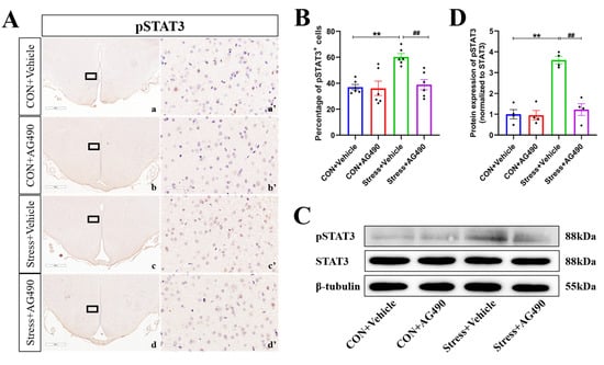 AG490 treatment inhibited the levels of pSTAT3 in stressed rats. (A,B) Representative micrographs and quantitative analysis of pSTAT3 immunohistochemical staining in DMH after AG490 treatment (n = 6). (a’–d’) are the magnified areas of (a–d), respectively. Scale bar = 900 µm in (a–d); scale bar = 50 µm in (a’–d’). (C,D) Representative Western blot images and densitometric quantification of pSTAT3 in the DMH (n = 4). Values are expressed as the mean ± SEM, ** p < 0.01, ## p < 0.01 vs. the control group.