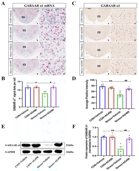 2.5. AG490 Treatment Alleviated the Stress-Induced Decrease in the GABAAR α1 Subunit
