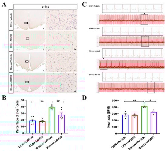 AG490 treatment reduced DMH neuronal activity and improved tachycardia in stressed rats. (A,B) Representative micrographs and quantitative analysis of c-Fos immunohistochemical staining in DMH after AG490 treatment (n = 6). (a’–d’) are the magnified areas of (a–d), respectively. Scale bar = 900 µm in (a–d); scale bar = 50 µm in (a’–d’). (C) Representative ECG records of rats after AG490 treatment. (D) Changes in heart rate in rats (n = 4). Values are expressed as the mean ± SEM, ** p < 0.01, # p < 0.05, ## p < 0.01 vs. the control group.