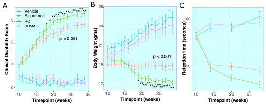 Effect of siponimod treatment on clinical course of TMEV disease: (A) Clinical disability score (CDS) for all animals throughout the study. (B) Body weights for all animals throughout the study. (C) Rotarod retention time in seconds for all animals throughout the study. The red line represents animals treated with siponimod at 3 mg/kg, the olive-green line represents vehicle-treated, the blue line represents healthy controls, and the purple line represents saline intracerebral SHAM injection. The color assignments for the different treatments are outlined in the figure. The two-way ANOVA calculated p value for siponimod vs. vehicle comparison are presented as text on the graph. * and ** represent p < 0.05 and p < 0.01, respectively, for Bonferroni–Hochberg-corrected p value for individual timepoint comparison for siponimod vs. vehicle-treated animals. The distance between the two whiskers represents inter-quartile distance from first to third quartile.