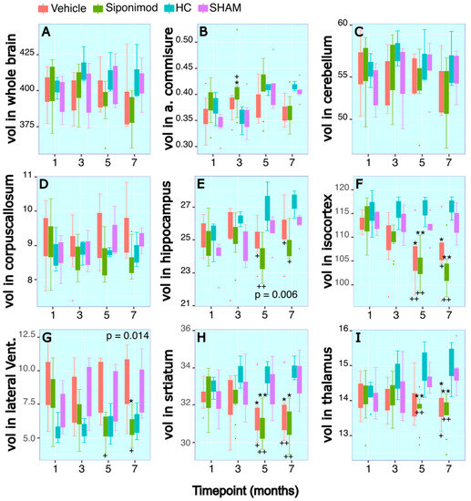 Longitudinal tracing of brain region-specific volumetric changes: (A–I) Longitudinal changes in volume (mm3) in the regions of whole brain, anterior commissure, cerebellum, corpus callosum, hippocampus, iso-cortex, lateral ventricles, striatum, and thalamus, respectively. The x axis presents scan timepoint in months and the y axis presents volume measured in mm3. The red graphs represents animals treated with siponimod at 3 mg/kg, the olive-green line represents vehicle-treated, the blue line represents healthy controls, and the purple graphs represents saline intracerebral SHAM injection. The color assignments for the different treatments are outlined in the figure. The two-way ANOVA-calculated p value for siponimod vs. vehicle-treated comparisons are presented as text on the graph. * and ** represent p < 0.05 and p < 0.01, respectively, for Bonferroni–Hochberg-corrected p value for individual timepoint comparison for siponimod vs. SHAM control group. + and ++ represent p < 0.05 and p < 0.01, respectively, for Bonferroni–Hochberg-corrected p value for individual timepoint comparisons for siponimod vs. healthy control animal group. The distance between the two whiskers represents inter-quartile distance from first to third quartile.