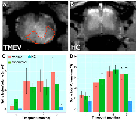 Longitudinal trace for spinal volume and lesion measures in TMEV mice: (A,B) Representative MRI spine scan images from a TMEV and a healthy control animal, respectively. The red dotted line shows an example of a manually drawn lesion ROI on the spine. (C,D) Spine lesion volume measured in a 9.35 mm long section of the spine, starting at the T10 vertebral disc. * represent p < 0.05, for Bonferroni–Hochberg-corrected p value for individual timepoint comparison with HC animal data. The red bar represents animals treated with siponimod at 3 mg/kg, the olive-green bar represents vehicle-treated, and the blue bar represents healthy controls. The color assignments for the different treatments are outlined in the figure. The distance between the two whiskers represents inter-quartile distance from first to third quartile.