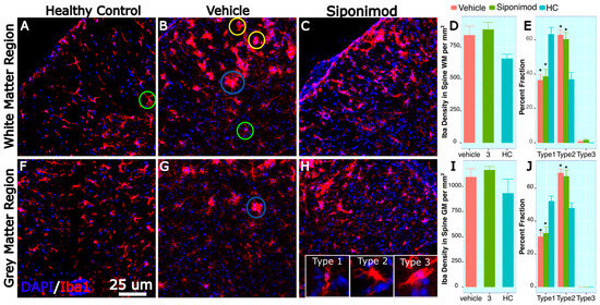 Spine microglial density changes in siponimod-treated TMEV animals: Spine tissue sections were stained for Iba1 and DAPI to label microglial cells and all cell nuclei, respectively. Images (A–C) are representative images of the spine white matter region, collected from healthy control, vehicle-treated, and siponimod-treated animals, respectively. (F–H) are representative images of the spine gray matter region collected from healthy control, vehicle-treated, and siponimod-treated animals, respectively. (D,I) are graphs presenting the density of Iba1-labeled cells in white matter and gray matter, respectively. (E,J) are graphs presenting percent fraction of the Iba1-labeled cells presenting type 1, 2, and 3 morphology. The inset in (H) contains representative images for normal morphology (type 1), activated branched morphology (type 2), and (type 3) amoeboid morphology. Green, blue, and yellow circles identify Iba1-labeled cells presenting type 1, 2, and 3 morphology, respectively, in (A–H). * p < 0.05, for Bonferroni–Hochberg-corrected p value for individual timepoint comparison with HC animal data. The red bar represents animals treated with siponimod at 3 mg/kg, the olive-green bar represents vehicle-treated, and the blue bar represents healthy controls. The color assignments for the different treatments are outlined in the figure. The scale bar refers to 25 μm length. The distance between the two whiskers represents inter-quartile distance from first to third quartile.