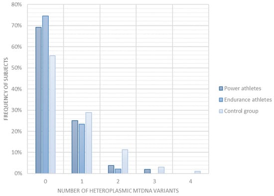 | Heteroplasmic mtDNA variants | 4 | number of heteroplasmic mtDNA variants is lower in athletes than in controls | 0.0079 | 0.027 |