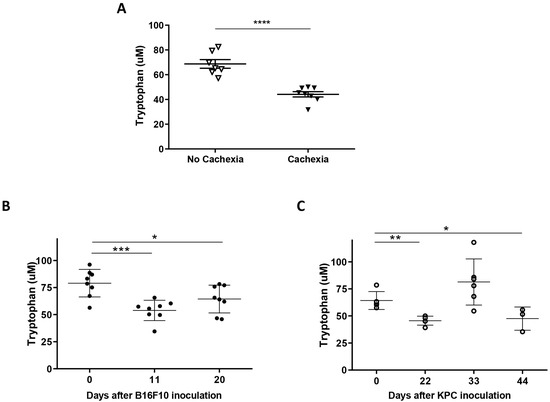 2.2. Plasma of Cachectic Cancer Patients and Tumor-Bearing Mice Showed Reduced Tryptophan Levels