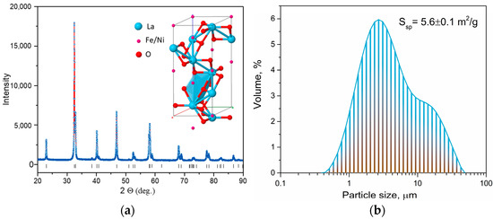 X-ray diffraction pattern (dots and line), where the vertical bars are the Bragg positions for the LaNi0.6Fe0.4O3−δ crystal structure. The insertion corresponds to the structure LaNi0.6Fe0.4O3−δ: https://materials.springer.com/isp/crystallographic/docs/sd_1044291, 17 July 2023. (a) and volume particle size distribution (b) of LNF powder.