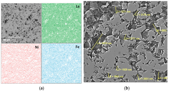 The microstructure, elemental composition, and quantitative content of the ceramics were assessed using scanning electron microscopy with energy-dispersive X-ray microanalysis. The results are shown in Figure 2. The secondary electron (SE) image provides detailed information about the plate’s polished surface. The ceramics have a polished surface with depressions caused by the roughness of coarse agglomerated particles. The chemical and elemental composition is homogeneous, which is validated by the La, Ni, and Fe distribution maps. The surface topography is visible in the backscattered electron (BSE) image. The size of closed near-surface defects and pores ranges from 1.8 to 9 μm. The ceramic grains are agglomerate and have individual sizes of 2–5 μm.