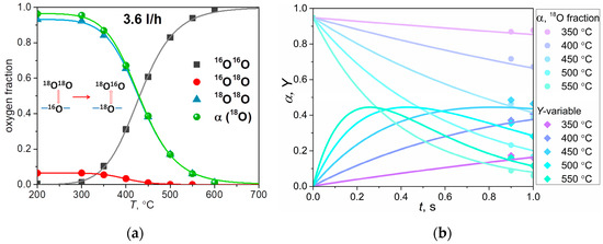 Certified materials were used to measure the kinetics of oxygen isotope exchange between the gas phase and the oxide. Figure 3a presents the temperature dependencies of the mole fractions of oxygen isotopologues and the mean 18O fraction in the gas phase (α = 0.5 × x34 + x36) at a gas carrier flow rate of 3.6 L/h.