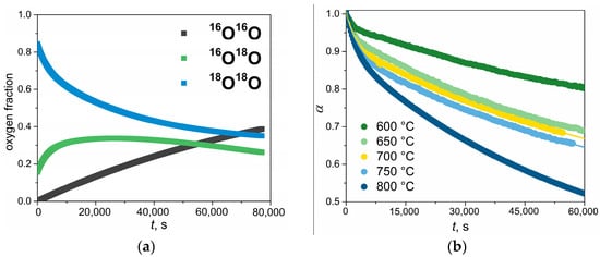 The time dependencies of the oxygen isotopologues fraction at 800 °C (a) and the 18O fraction (α) at 600–800 °C (b) obtained in the IE-GPE experiments at 10 mbar.