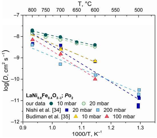 The diffusion transport slows down when there is a change of between 10 and 20 mbar (Figure 5). Similar behavior can be observed in perovskite oxide materials that follow the D = f(PO2) relationship [41,42,43]. As LaNi0.6Fe0.4O3−δ oxide has an oxygen transfer vacancy mechanism, decreasing oxygen pressure results in a decrease in oxygen non-stoichiometry, which subsequently slows down diffusive oxygen transfer.