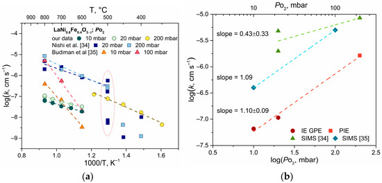 Arrhenius-type plot (a) and PO2-type plot at 800 °C (b) of the surface exchange coefficient of LNF oxide measured by different isotopic methods [34,35].