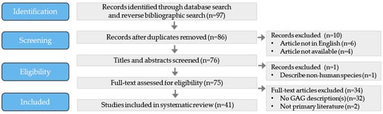 The size distribution of GAGs is summarized in Figure 2B. The mean diameter of GAGs was 1.9 cm ± 1.1 cm (standard deviation), though diameters ranged from 0.4 to 6.0 cm (Table 2). Notably, five reported GAGs measured less than 1 cm in diameter (range: 4 to 9 mm) [26,32,33]. There was no direct correlation of GAG size with age [11]. The person’s age and GAG size were recorded for only 24 persons with recorded gender. Analyses among these cases revealed no statistically significant difference in mean age across male versus female individuals (females, 38 years; males, 45 years). However, a statistically significant difference was noted for GAG diameter across sex (females, 1.78 cm; males, 3.39 cm; p < 0.05) [3,13,15,16,20,23,26,27,28,29,30,31,32,33]. GAGs also varied in shape. Typically, GAGs were well-defined, nodular, round-to-ovoid structures, but others were irregular and a discrete, oblong vermiform shape was also characterized in one person (1%) [31].