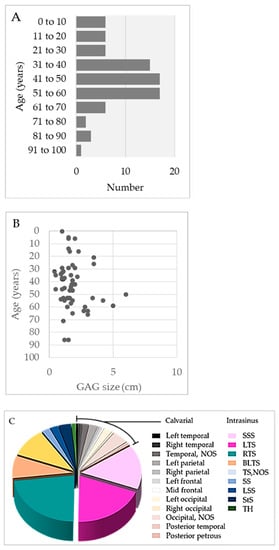 (A) Summary of the age distribution of persons with GAGs, according to decade of life. (B) GAG size distribution according to age. (C) Summary of GAG distribution by location.