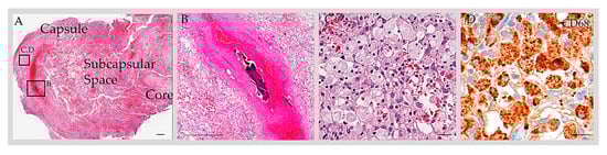 Anatomy of GAG. H&E-stained section of a GAG dome that was resected from an adult patient with post-traumatic headache revealed a multilaminar structure composed of a capsule, subcapsular space, and core (A). The subcapsular space contained blood and cells. On a high-power exam, a thrombosed vein (B) and foam cells (C) were present within the structure. Immunohistochemistry for CD68 highlighted a prominent number of cells, consistent with macrophages (D). Scale bars = (A,B), 100 µm; (C,D), 10 µm. Copped areas (black boxes in (A)) are shown in (B–D). Images reproduced from Int. J. Mol. Sci. 2023, 24, 11410 [45].