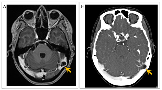 Diagnosis of GAG on imaging workup (Table S1) was accomplished by visualization of round-to-ovoid, irregular or oblong, unilocular or multilocular cystic-appearing structures with or without internal septations, and with internal CSF-like density or signal intensity and communication with the subarachnoid space on MRI with and/or without contrast [8,13,15,17,19,20,22,23,24,25,26,28,30,31,36,37,38,39] (Figure 4A), MR angiogram/venogram [10,23,25,34,35,36,39,40,41,42], CT with and/or without contrast, or CT angiogram [8,21,25,27,28,31,34,35] (Figure 4B). GAGs were also identified as well-delineated focal calvarial defects on plain X-ray [13,15] or as focal filling defects within the DVS on conventional angiography and/or on cross-sectional studies [11]. GAGs with bone involvement caused smooth, evenly marginated impressions on the inner table of the skull and sometimes expanded into the diploic space, rarely eroding the outer skull table. Eight extrasinus-type GAGs that exhibited large “erosive” or “destructive” osteolytic calvarial defects were suspected to be malignant tumors [3,12,13,15,16]. MRI was the test of choice for differentiating GAGs from DVS thrombosis.