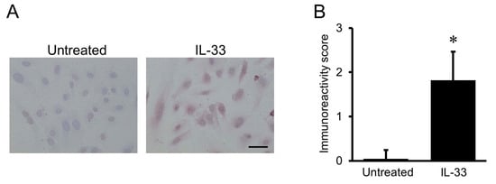 Interleukin (IL)-33-stimulated monocyte chemoattractant protein (MCP)-1 protein expression in human umbilical vein endothelial cells (HUVECs). (A) Representative immunocytochemical staining showing the localization of MCP-1 in HUVECs with or without exposure to 10−9 mol/L of IL-33 for 24 h. Intensity of immunoreactivity for MCP-1 was increased in HUVECs treated with IL-33 compared with the untreated cells. Original magnification: ×400. Scale bar = 50 μm. (B) Semiquantitative analysis of staining intensity of immunoreactivity for MCP-1. * p < 0.05 vs. untreated cells.