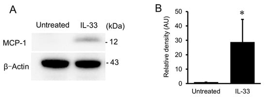 (A) Western immunoblot analysis of the whole-cell lysates using anti-MCP-1 antibody in HUVECs with or without exposure to 10−9 mol/L of IL-33 for 24 h. (B) Bars represent densitometric data of each expression signal after normalization to β-actin and relative to the untreated cells. MCP-1 protein expression was increased in HUVECs treated with IL-33 compared with the untreated cells. * p < 0.05 vs. untreated cells.