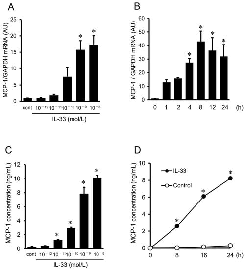 Chemokines are small-molecule inflammatory proteins that are divided into four canonical subclasses according to the position of N-terminal cysteine residues: C, CC, CXC, and CX3C chemokines []. MCP-1, also known as CCL2, plays a central role in the pathogenesis of several different disease processes, including vascular permeability and attraction of immune cells during metastasis, various neurological disorders, autoimmune disease, obesity, and atherosclerosis []. We previously reported that IL-33 enhanced MCP-1 protein expression in HUVECs by the method of antibody array assay []. Previous studies also demonstrated that IL-33 increased MCP-1 expression in various cells, including human and mouse mast cells [,,,], human corneal epithelial cells [], human vascular endothelial cells [,], and human cancer cells [,]. In the present study, immunocytochemical examination and Western immunoblot assay revealed that IL-33 increased MCP-1 protein expression in HUVECs. In addition, real-time PCR and ELISA demonstrated that IL-33 increased gene expression and protein secretion of MCP-1 in a dose- and time-dependent manner in HUVECs. The biological roles of IL-33-induced MCP-1 upregulation in various cells need further investigation.