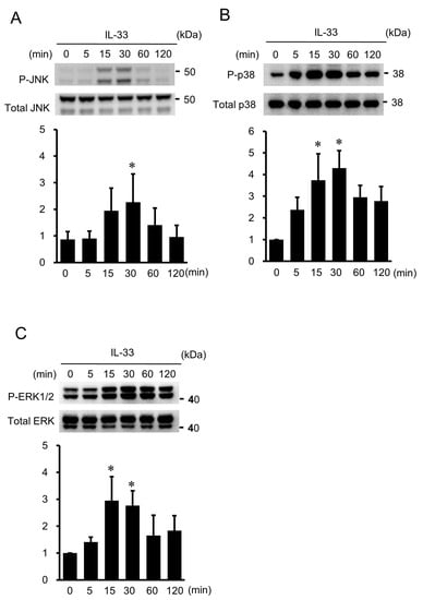 IL-33-activated mitogen-activated protein kinase (MAPK) pathway in HUVECs. (A–C) Western immunoblot analysis showed that IL-33 stimulated the phosphorylation of c-jun N-terminal kinase (JNK) (A), p38 MAPK (B), and extracellular signal-regulated kinase (ERK) 1/2 (C). HUVECs were treated with 10−9 mol/L of IL-33 for 5, 15, 30, 60, and 120 min. Bars represent results from densitometric analyses of each phosphorylation signal after normalization to total protein and relative to the untreated control (0 min). Blots are representative of three independent experiments. * p < 0.05 vs. 0 min.